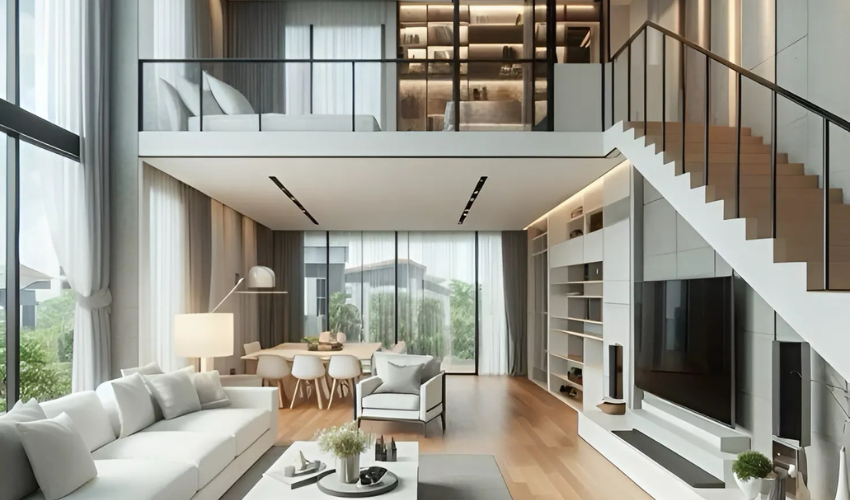 Trong thiết kế nội thất hiện đại, ánh sáng tự nhiên được tận dụng tối đa qua cửa sổ, giếng trời hoặc cửa kính lớn để giúp không gian thông thoáng. Mặc dù không thể kiểm soát trực tiếp cường độ ánh sáng, việc sử dụng các vật liệu như kính màu hay gương giúp điều chỉnh ánh sáng sao cho phù hợp với phong cách và bố cục nội thất.