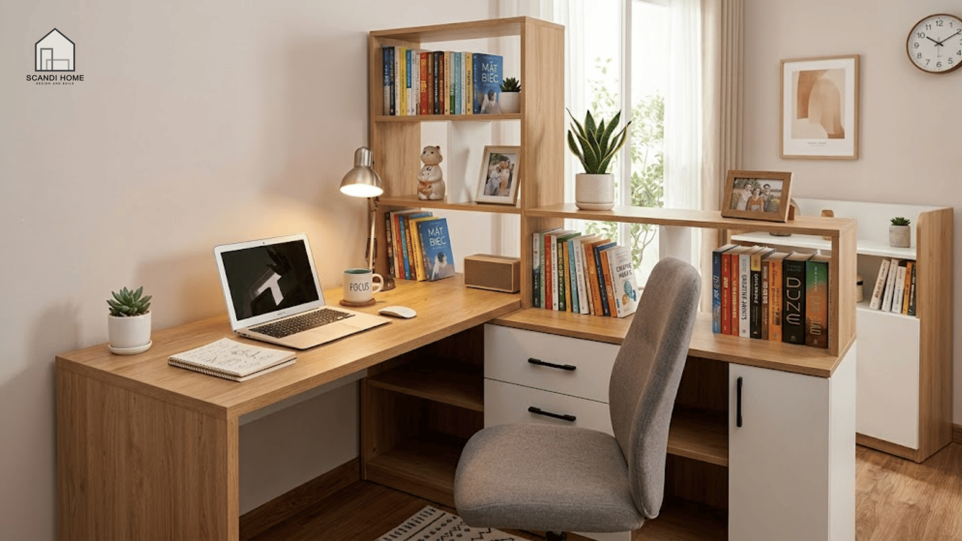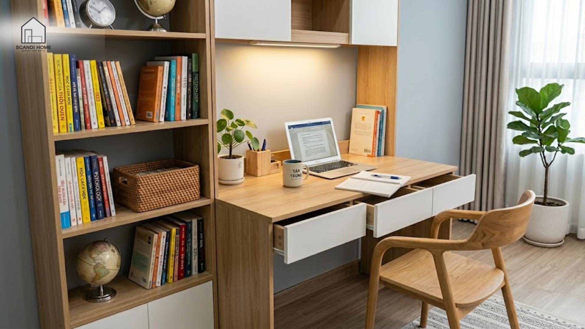 Đây là giải pháp “all-in-one” vừa đảm bảo công năng học tập, vừa giữ không gian luôn gọn gàng, có tính thẩm mỹ cao và giúp tối ưu lưu trữ mà không cần thêm nội thất phụ trợ.