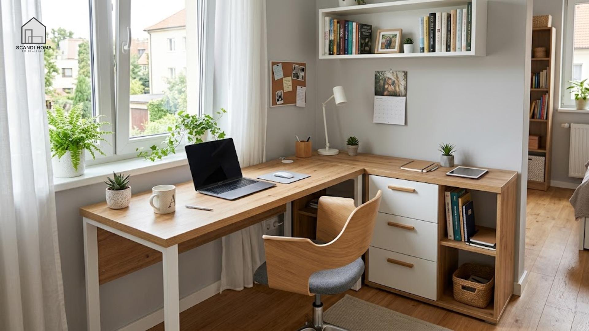 Thiết kế chữ L tận dụng tối đa các góc chết trong phòng, mở rộng diện tích mặt bàn mà không làm ảnh hưởng đến lối di chuyển chung.