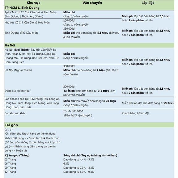 - Riêng đối với sản phẩm quá cồng kềnh (>1m8) chưa được hỗ trợ vận chuyển và lắp đặt.