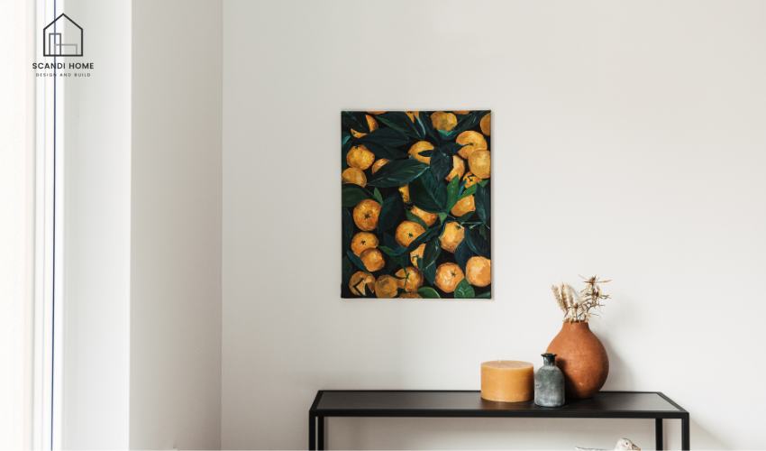 Một hoặc hai bức tranh đơn giản có thể mang đến nét cá tính riêng cho phòng khách. Trong phong cách tối giản, hãy ưu tiên tranh đơn sắc, tranh line-art, hoặc ảnh chụp phong cảnh nhẹ nhàng. Kích thước nên vừa phải, không quá lớn và tránh khung quá dày.