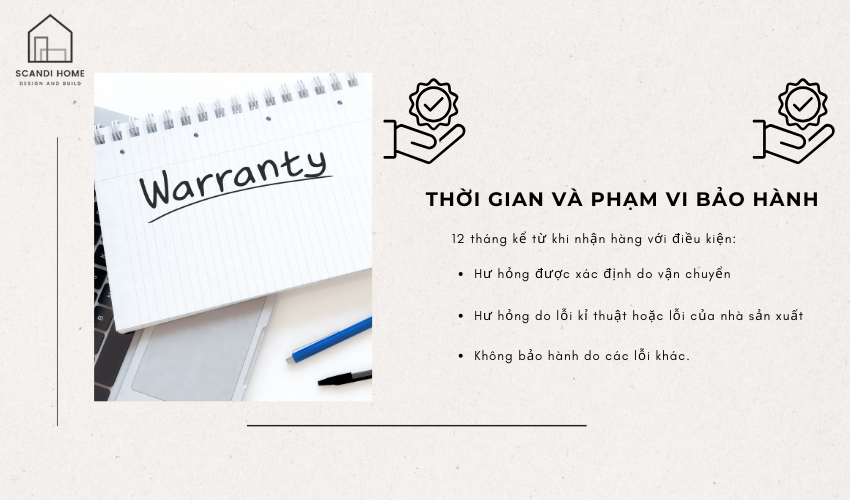 Tất cả sản phẩm được Scandi Home bảo hành trong 12 tháng kể từ ngày nhận hàng. Chúng tôi nhận bảo hành nếu lỗi xuất phát từ kỹ thuật sản xuất hoặc do vận chuyển. Những lỗi như cong vênh, gãy kết cấu, bung keo nếu không do tác động của người dùng đều nằm trong phạm vi hỗ trợ. Điều này giúp khách hàng yên tâm tuyệt đối khi sử dụng nội thất mỗi ngày.