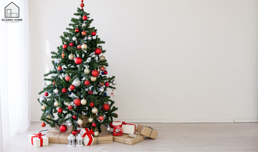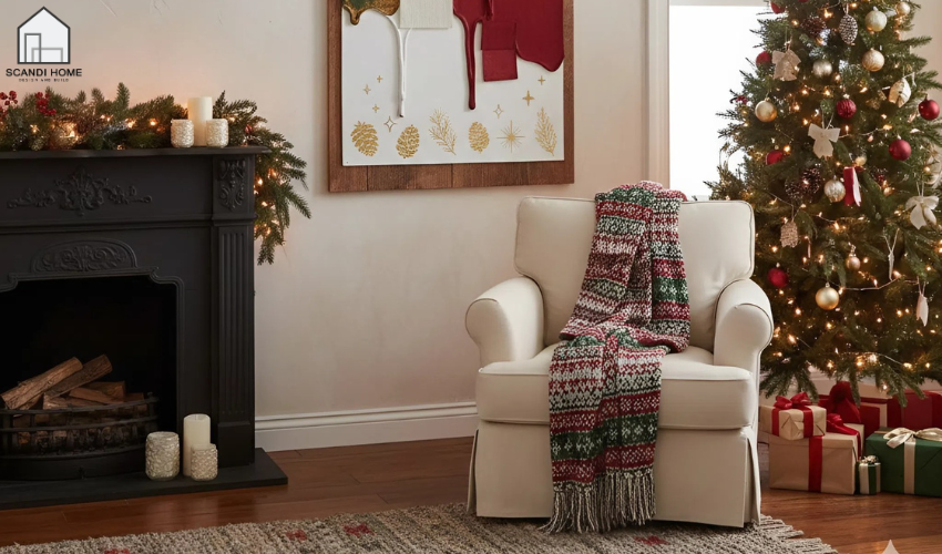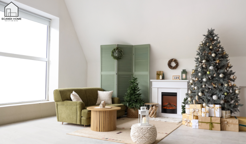 Bạn có thể thêm đỏ hoặc xanh lá để tạo điểm nhấn nhẹ nhàng. Những sắc màu này phù hợp tinh thần Giáng sinh nhưng vẫn giữ sự tối giản. Việc tiết chế màu làm phong cách Scandi nổi bật hơn.