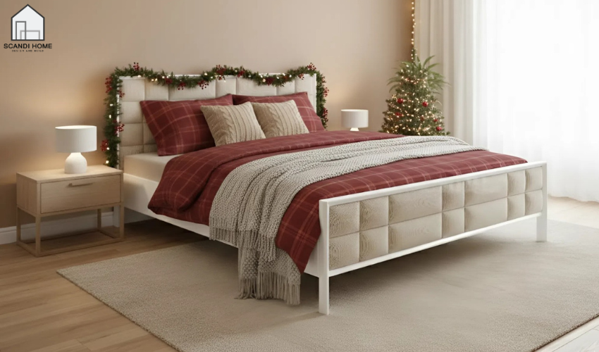Giường có bọc đệm đầu tạo cảm giác êm ái trong những ngày se lạnh cuối năm. Bạn có thể chọn ga giường đỏ, trắng hoặc họa tiết caro để tăng không khí lễ hội. Sự kết hợp giữa gỗ và vải giúp phòng ngủ vừa ấm vừa tinh tế.