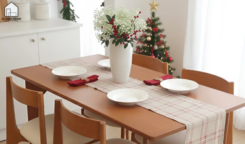 Bộ bàn ăn gỗ sồi hoặc gỗ tự nhiên mang lại cảm giác ấm cúng cho mỗi bữa ăn dịp Giáng sinh. Tông gỗ vàng nhạt phù hợp vibe Bắc Âu và dễ dàng nổi bật dưới ánh đèn vàng. Chất gỗ tự nhiên cũng giúp không gian nhỏ nhìn thân thiện và gần gũi hơn.