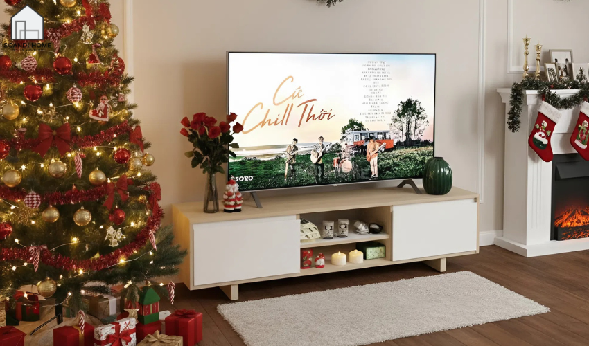 Kệ tivi phong cách tối giản giúp phòng khách trông ngăn nắp và sáng sủa hơn. Bạn chỉ cần thêm một vài phụ kiện nhỏ như nến thơm hoặc hộp gỗ để tăng vibe Giáng sinh. Tất cả vẫn giữ được sự gọn gàng vốn có của phong cách Bắc Âu.