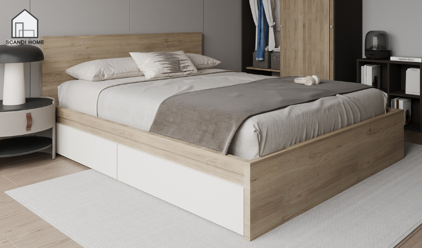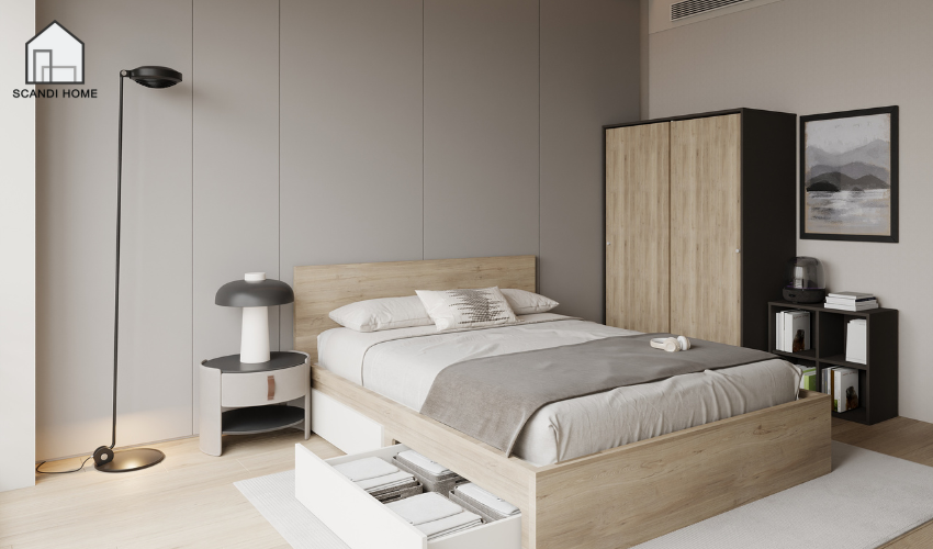 Ngoài vẻ đẹp thẩm mỹ, giường ngủ có hộc kéo hoặc ngăn chứa đồ cũng là lựa chọn thông minh cho decor phòng ngủ nhỏ. Sự kết hợp giữa công năng và kiểu dáng đơn giản giúp căn phòng vừa đẹp, vừa tiết kiệm không gian hiệu quả.