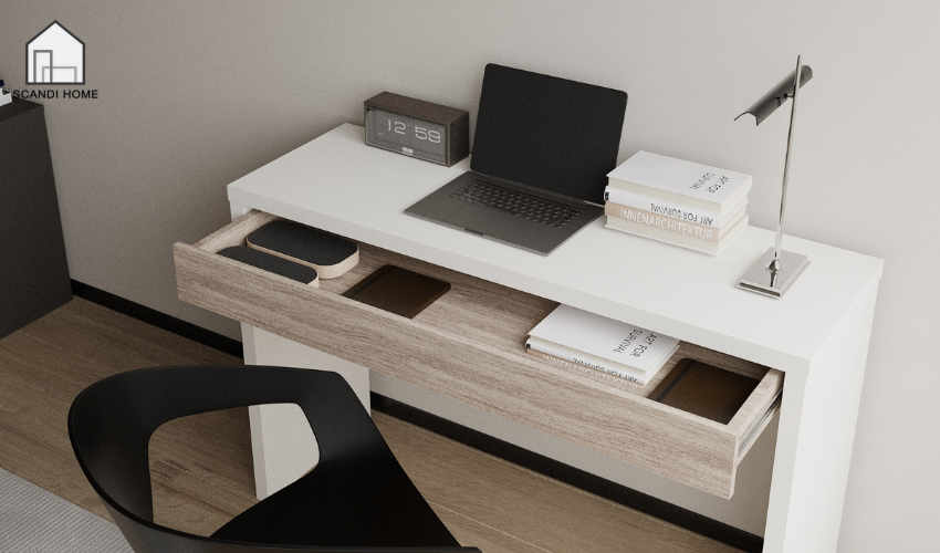 Bàn học hoặc bàn làm việc trong phòng ngủ là nơi kết nối giữa nghỉ ngơi và sáng tạo. Một chiếc bàn gọn gàng, có ngăn kéo tiện lợi giúp bạn lưu trữ tài liệu và vật dụng cần thiết. Chất liệu gỗ công nghiệp hoặc gỗ tự nhiên mộc mạc mang lại cảm giác gần gũi và ấm áp.