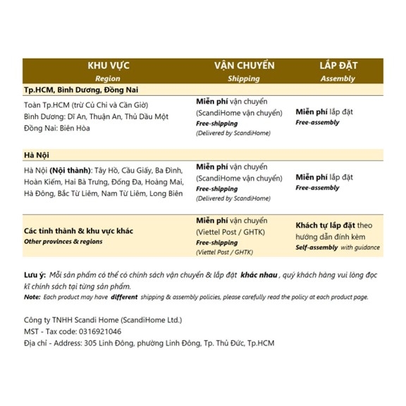 Đối với khách hàng ở các khu vực trọng điểm dưới đây, ScandiHome freeship và lắp đặt tận phòng:
