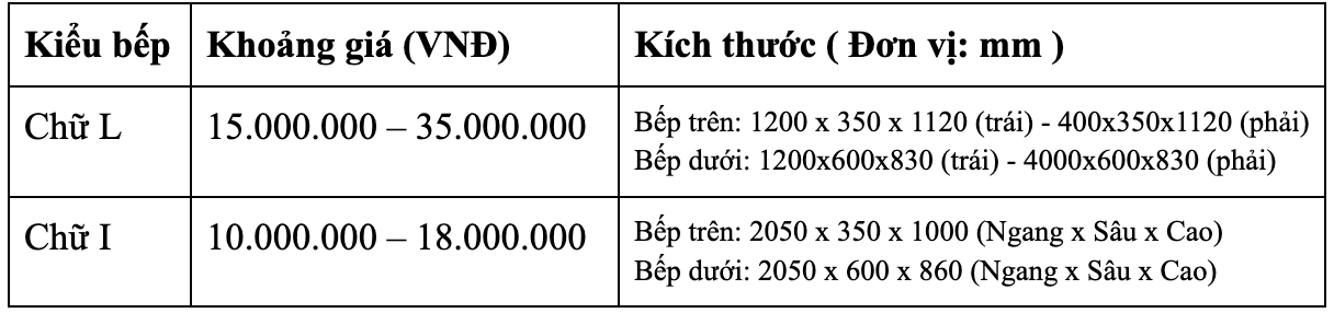 Dưới đây là bảng tổng hợp giá theo từng kiểu bố trí bếp phổ biến, đã được tối ưu lại để bạn dễ so sánh: