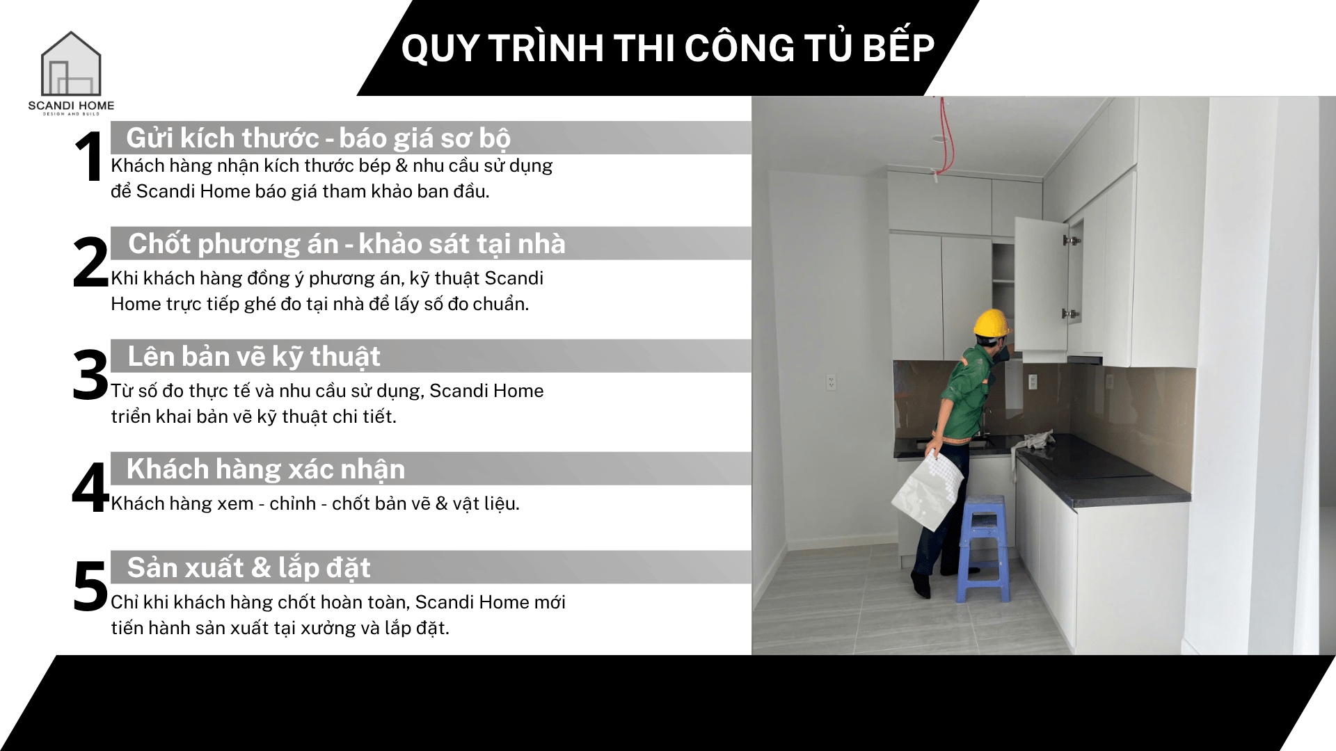Quy trình thi công tủ bếp tại Scandi Home được triển khai theo các bước rõ ràng nhằm đảm bảo tính chính xác và minh bạch.