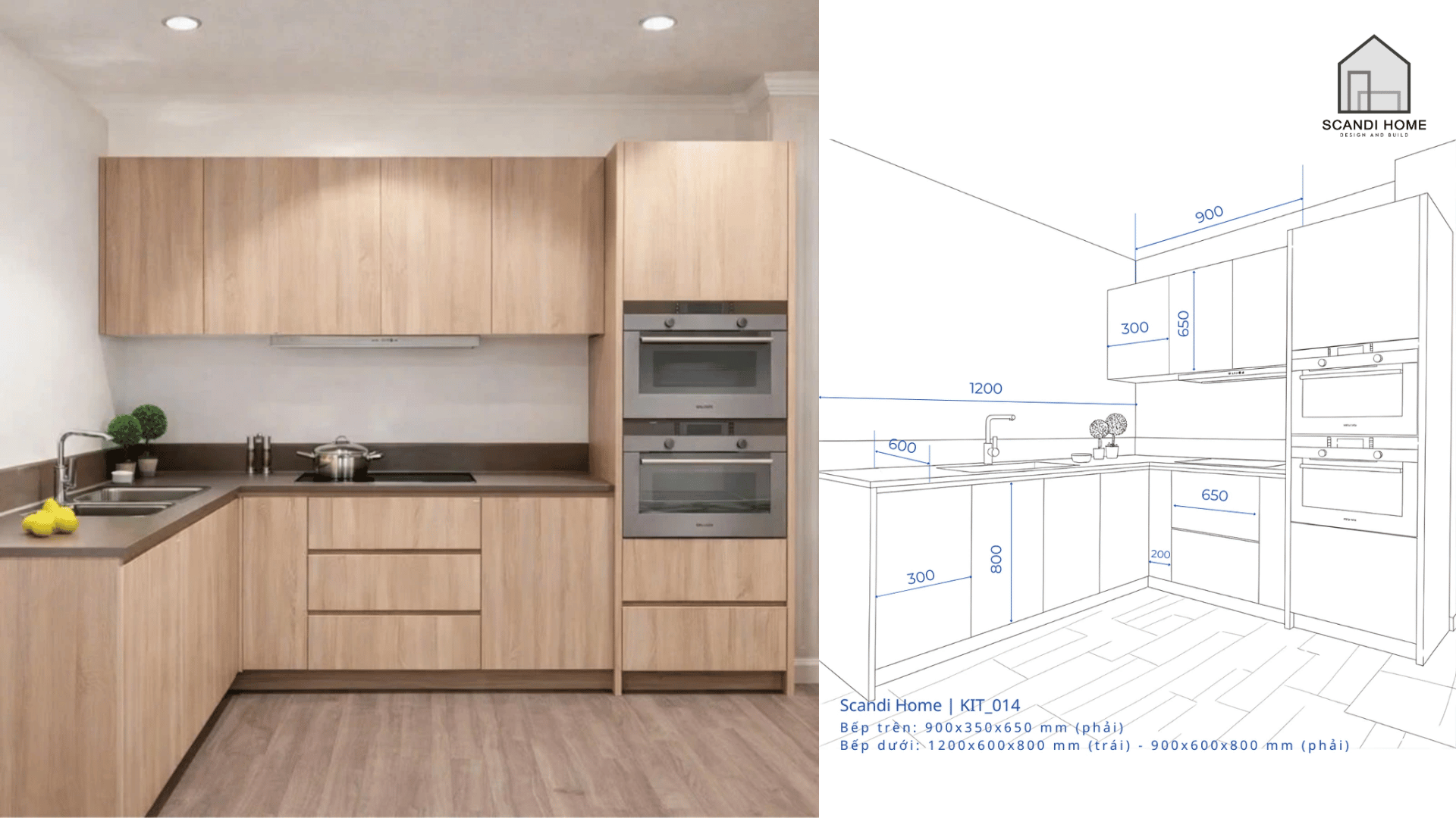 Nhận xét: Tại Scandi home có hai phân loại là MDF chống ẩm và Ván nhựa. Để tối ưu chi phí nhưng vẫn mang lại chất lượng sử dụng hiệu quả, chúng tôi khuyến khích sử dụng toàn bộ bếp là MDF chống ẩm, riêng khu vực thùng lavabo là ván nhựa.