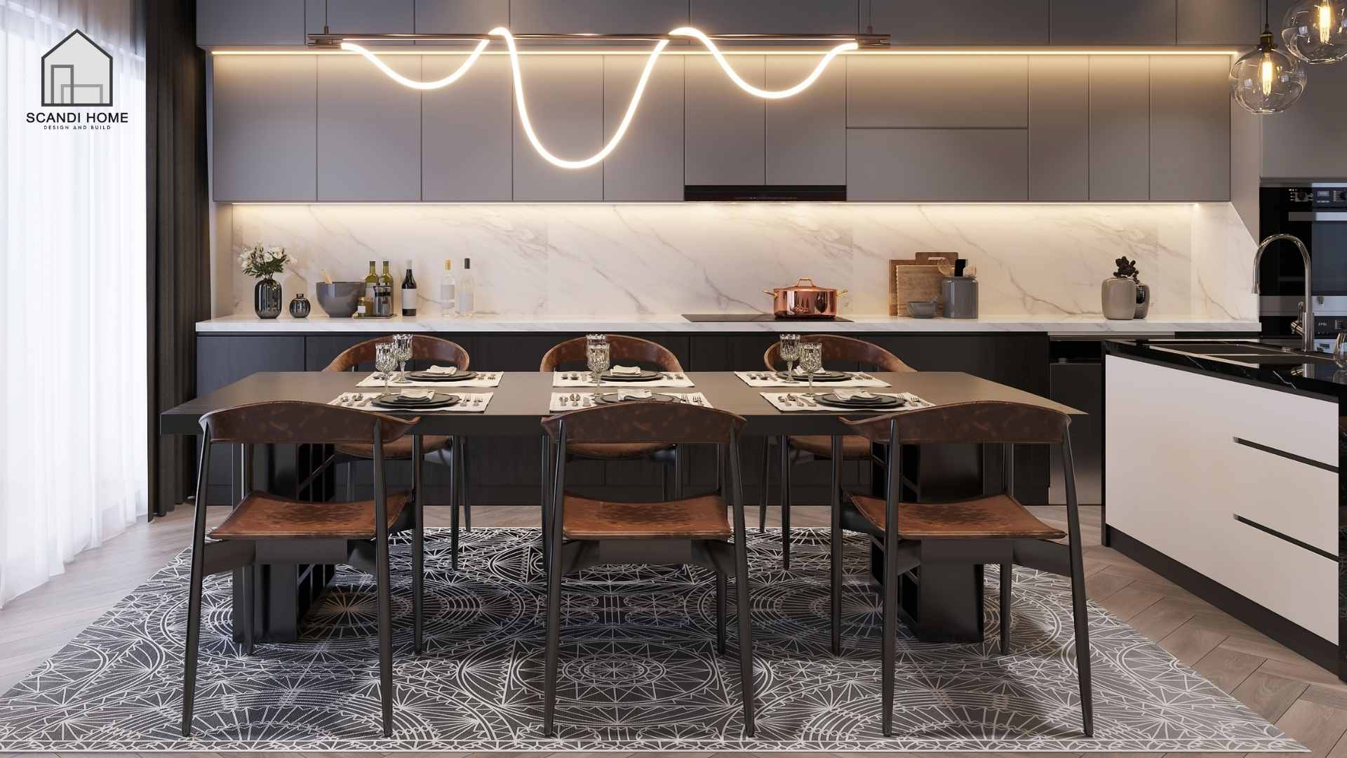 Ngoài ra, kiểu bàn này cũng rất dễ sắp xếp trong khu vực bếp liên thông hoặc không gian nhỏ gọn. Đây là lựa chọn phổ biến tại nhiều căn hộ hiện đại hiện nay.