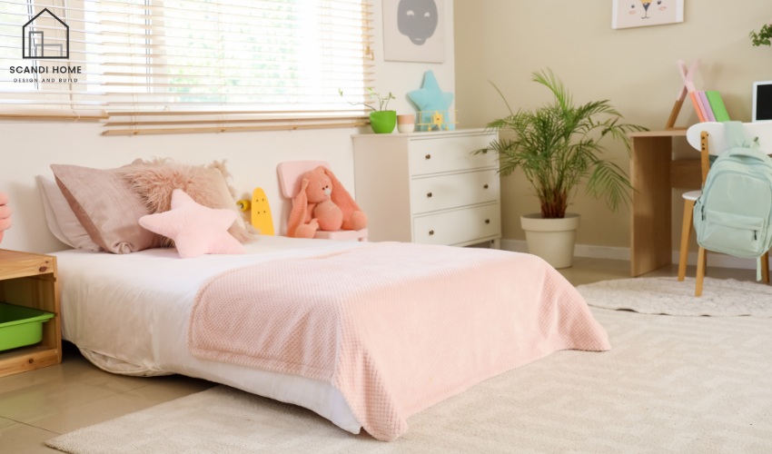 Khi chọn giường, bạn nên ưu tiên loại có chiều cao vừa phải, bề mặt nhẵn mịn, không cạnh sắc. Giường bằng gỗ công nghiệp chống ẩm hoặc gỗ tự nhiên bo tròn góc là lựa chọn an toàn. Một chiếc giường không chỉ là nơi nghỉ ngơi, mà còn là nơi hình thành thói quen sống gọn gàng và ngăn nắp cho trẻ ngay từ sớm.
