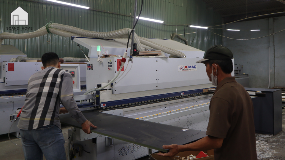Nguyên vật liệu được đưa vào sản xuất tại xưởng với hệ thống máy móc hiện đại. Các công đoạn cắt, ghép, dán cạnh đều được thực hiện chính xác theo bản vẽ. Điều này giúp sản phẩm có độ hoàn thiện cao và hạn chế lỗi kỹ thuật. -