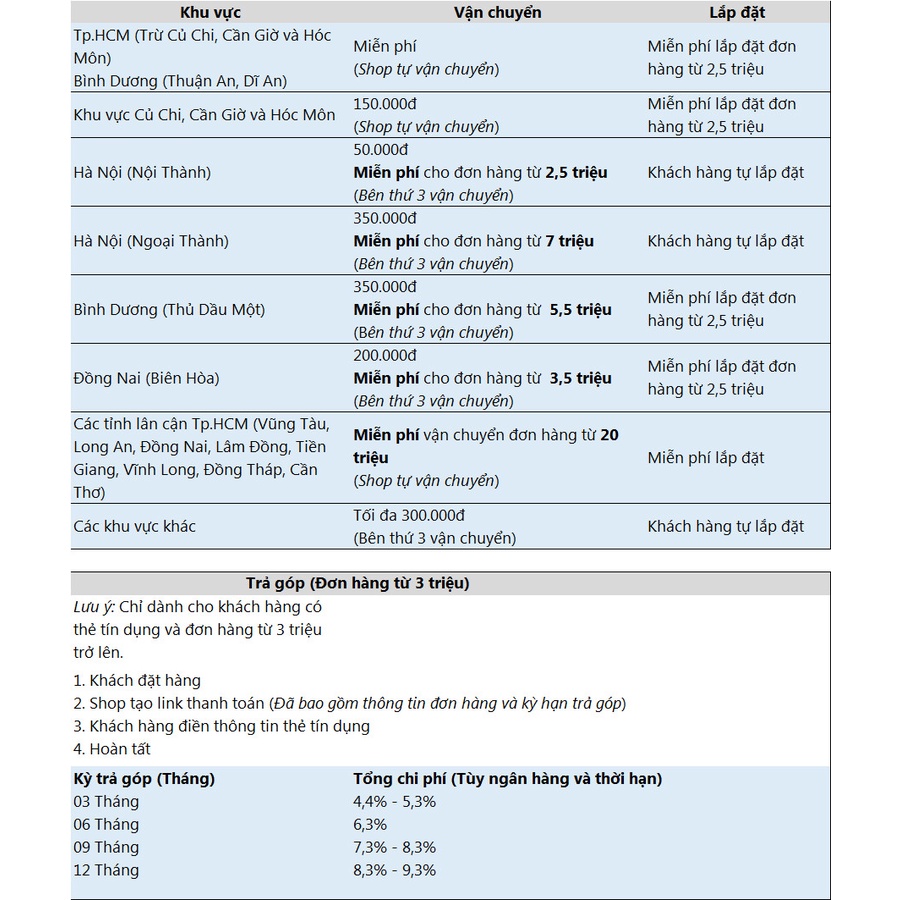 - Riêng đối với sản phẩm quá cồng kềnh (>1m8) chưa được hỗ trợ vận chuyển và lắp đặt.
