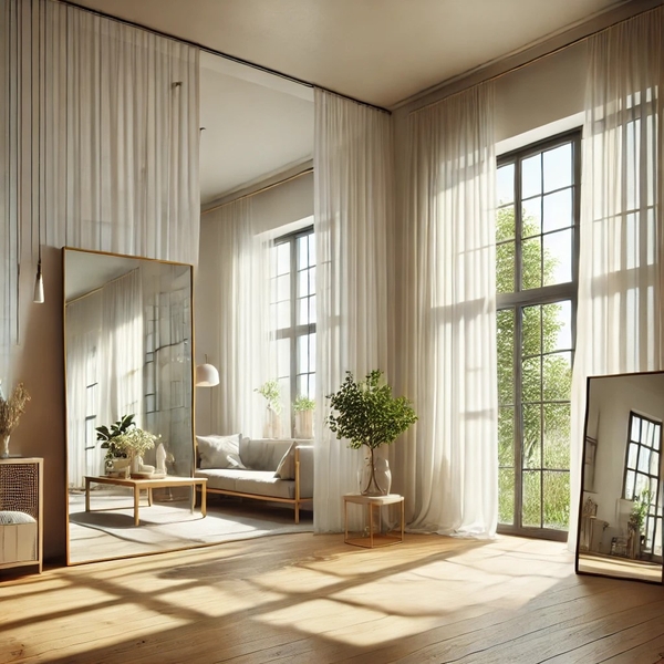Ý tưởng: Đặt gương lớn cạnh cửa sổ để phản chiếu ánh sáng, giúp căn phòng thêm rực rỡ.