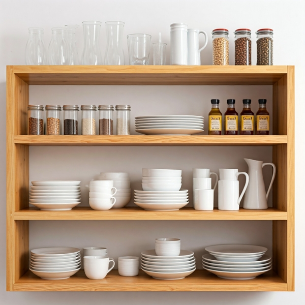 Ý tưởng: Đặt các kệ mở ở phòng bếp để trưng bày bát đĩa hoặc gia vị.