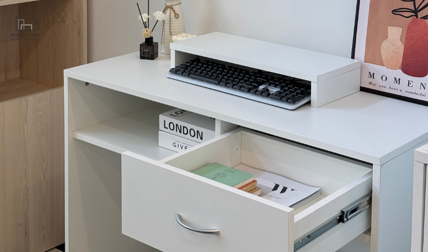 Không chỉ để cất giữ sách vở, ngăn kéo phụ còn có thể được sử dụng như bàn phụ nhỏ. Người dùng có thể đặt laptop, máy in hoặc vật dụng cá nhân lên trên. Thiết kế hiện đại và màu sắc trung tính của sản phẩm dễ dàng kết hợp với các món nội thất khác trong góc học tập.
