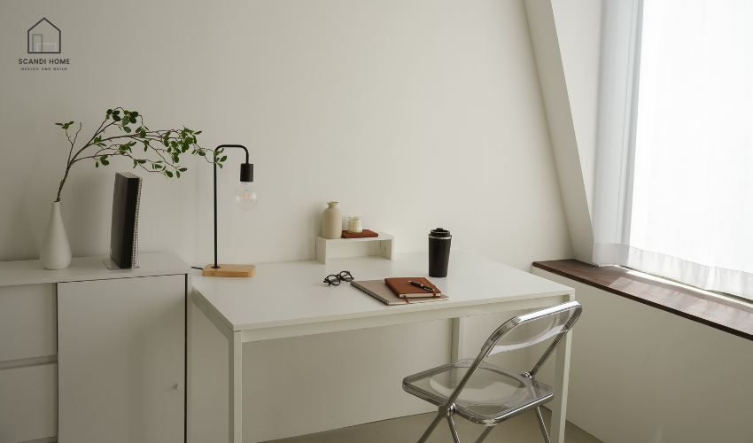 Nếu không gian nhỏ, bạn có thể chọn bàn học có ngăn kéo hoặc hộc tủ để lưu trữ thêm. Điều này giúp giữ cho mặt bàn luôn gọn gàng, đúng với tinh thần tối giản mà Scandinavian hướng đến.