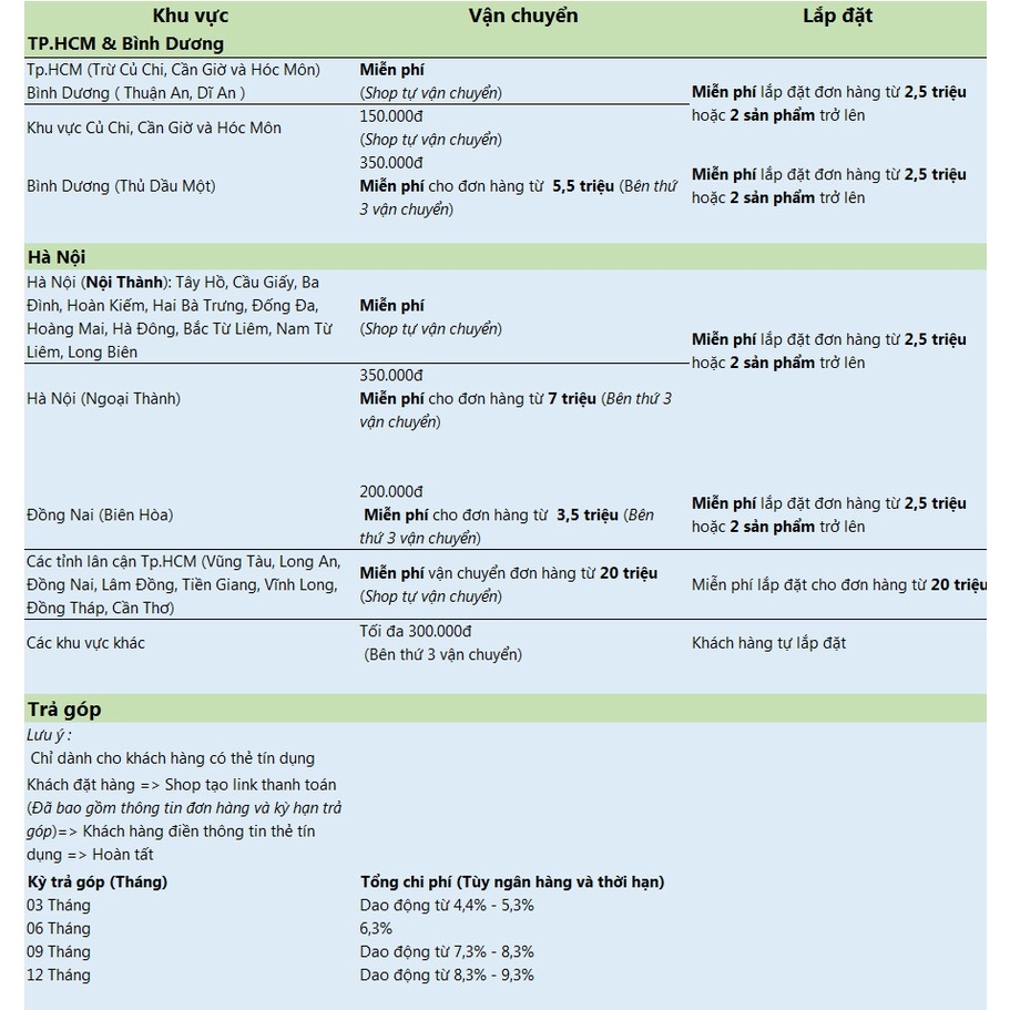 Vận chuyển và Lắp đặt: